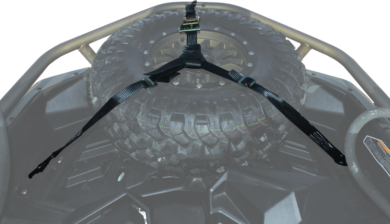 The DragonFire Spare Tire Tie-Down Strap features rubber-coated snap hooks and a heavy-duty ratchet system that fits up to 37 in. tires.