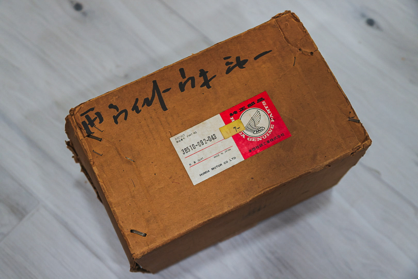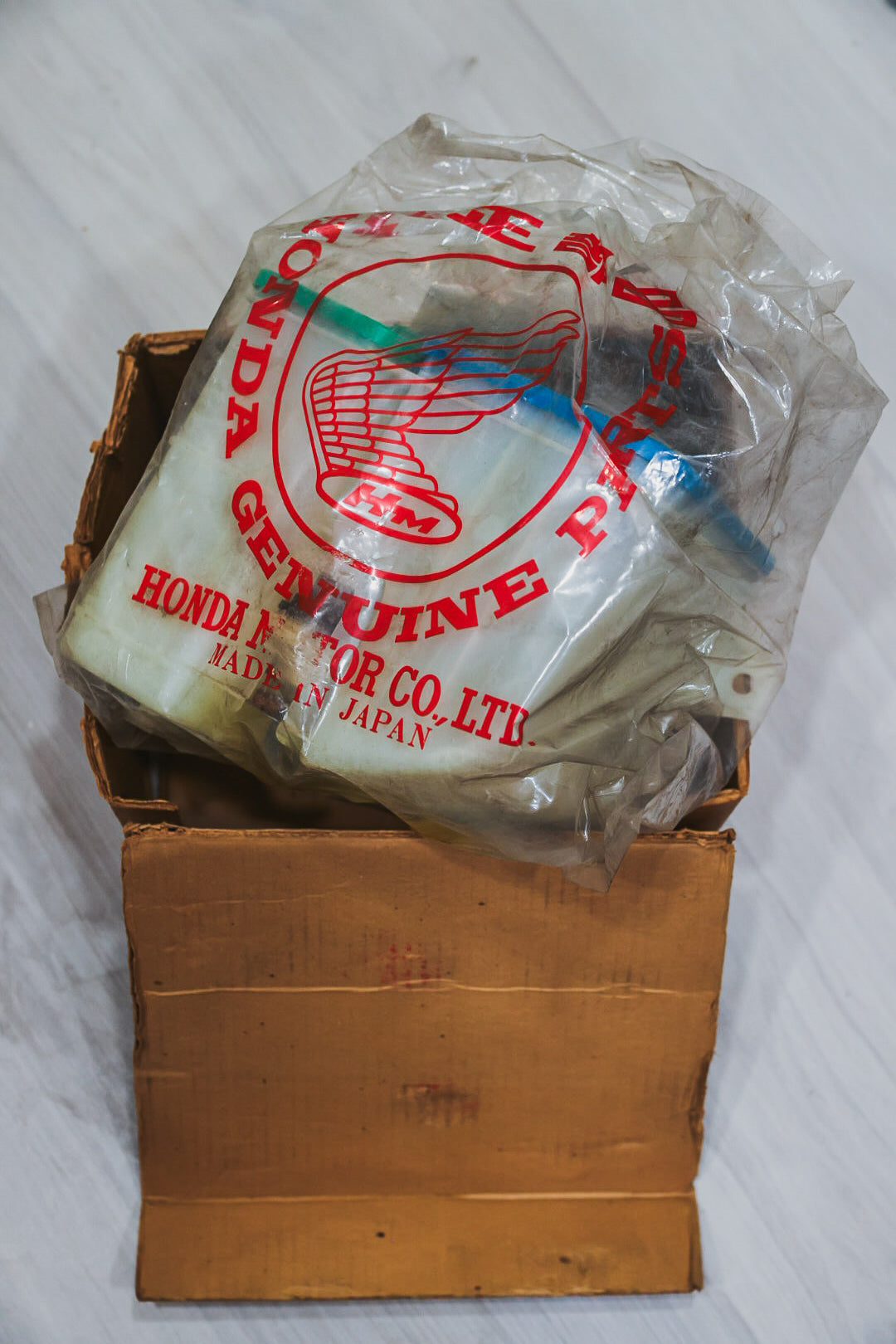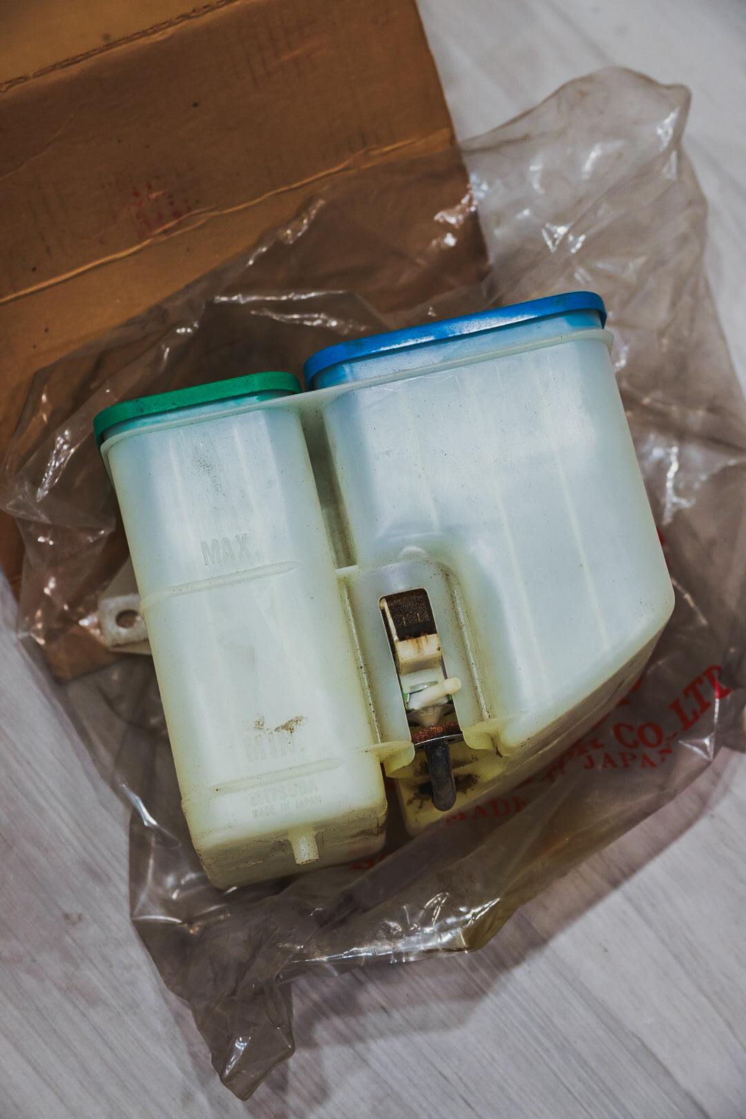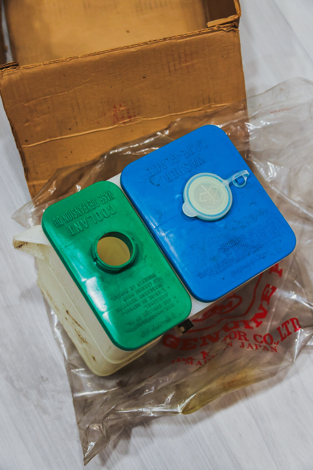NOS washer/coolant reservoir for both LHD and RHD 1979-1982 Honda Prelude SN. Some foam dust on the container from what seems to be a deteriorating foam washer near the washer motor.