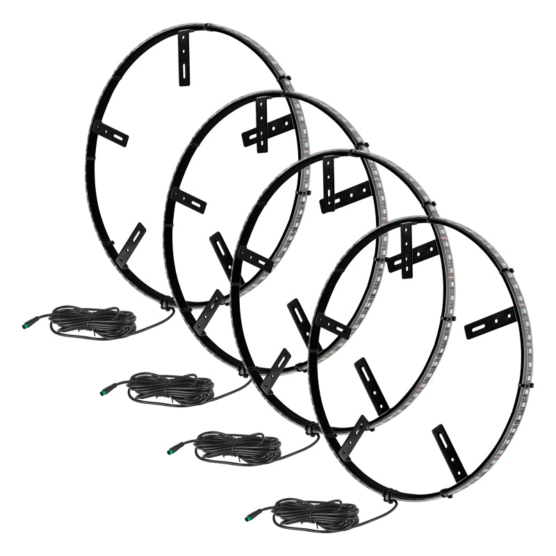 ORACLE Lighting illuminated LED wheel rings are an easy and effective way to light up the wheels on your car or truck! This head-turning lighting product consists of a set of (4) LED illuminated aluminum rings which install around the brake rotor and attaches to the brake dust shield. These can also be mounted to older vehicles with drum brakes. The effect is a large ring of light which accents custom wheels and stands out at events. Oversized 16.5" diameter is the largest on the market and fits oversized brakes.  This kit now features a TRUE white 6000K from separate white LEDs for a TRUE WHITE output for a Crisp & Clean white light. Change Colors, Control Brightness, access strobing patterns, and sync with music! Now featuring Dual-Control allowing the user to use both the free Bluetooth Smartphone App control PLUS the included Wireless Remote Control.  Installation is easy with waterproof Plug & Play Connectors that easily connect the individual rings to the central control box. Battery connection leads include ring terminals and in-line fuse for simplified wiring installation. There is also a pre-wired On/Off switch that can be used to manually turn the system on and off for maximum control.  Additional upgrades to our LED wheel lights include thicker aluminum rings, black powder-coat anti-corrosive finish, waterproof connectors, and pre-installed brackets.  Installation tip: For extra security of the screws holding in the brackets on wheel rings, first confirm that the wheel rings' brackets are in the correct mounting location. Then, apply an appropriate amount of Loctite to these screws to ensure a firm hold.  If your vehicle is equipped with drum brakes or does not have a brake dust shield you will need to perform additional fabrication of brackets to fit properly.  Please note, these rings are not intended for use while driving.