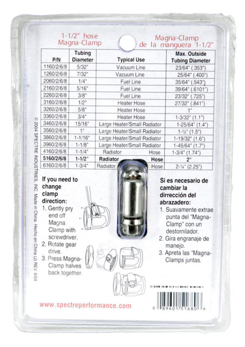 Spectre Magna-Clamp 5168 is designed to fit 1-1/2 inch inside diameter as well as AN-28 radiator hose that has a maximum outside diameter of 2 inches including any covering. The stainless steel gear drive clamp features a two-piece chrome plated aluminum housing that provides secure tightening at an affordable price. Magna-Clamps are designed to perform as well as they look and are ideal for race, street, and show.